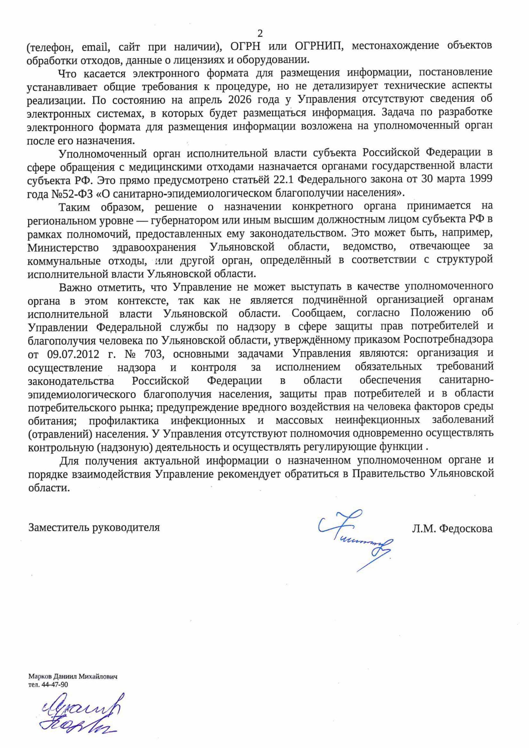Благодарим за Ваше неравнодушное отношение к Вологодской области. В Вологодской области органом, уполномоченным на размещение на официальном сайте в сети Интернет сведений, предусмотренных ст.22.1 Федерального закона от 30 марта 1999 года № 52-ФЗ «О санитарно-эпидемиологическом благополучии населения», определено Министерство здравоохранения Вологодской области. Постановлением Правительства Вологодской области от 17 марта 2026 года № 293 «О внесении изменения в постановление правительства области от 7 ноября 2024 года № 1293» Положение о Министерстве здравоохранения Вологодской области дополнено полномочием следующего содержания: Осуществляет размещение на официальном сайте в информационно-телекоммуникационной сети «Интренет» сведений о лицах, осуществляющих оказание услуг по транспортированию, обезвреживанию медицинских отходов на территории Вологодской области, об иных лицах, осуществляющих обеззараживание медицинских отходов, а также об объектах, которые расположены на территории Вологодской области и на которых указанными лицами осуществляются обеззараживание, обезвреживание медицинских отходов, за исключением сведений, составляющих государственную и иную охраняемую законом тайну.». Правила размещения на официальном сайте уполномоченного исполнительного органа субъекта Российской Федерации сведений об иных лицах, осуществляющих обеззараживание медицинских отходов, о лицах, осуществляющих оказание услуг по транспортированию, обезвреживанию медицинских отходов на территории субъекта Российской Федерации, утверждены постановлением Правительства Российской