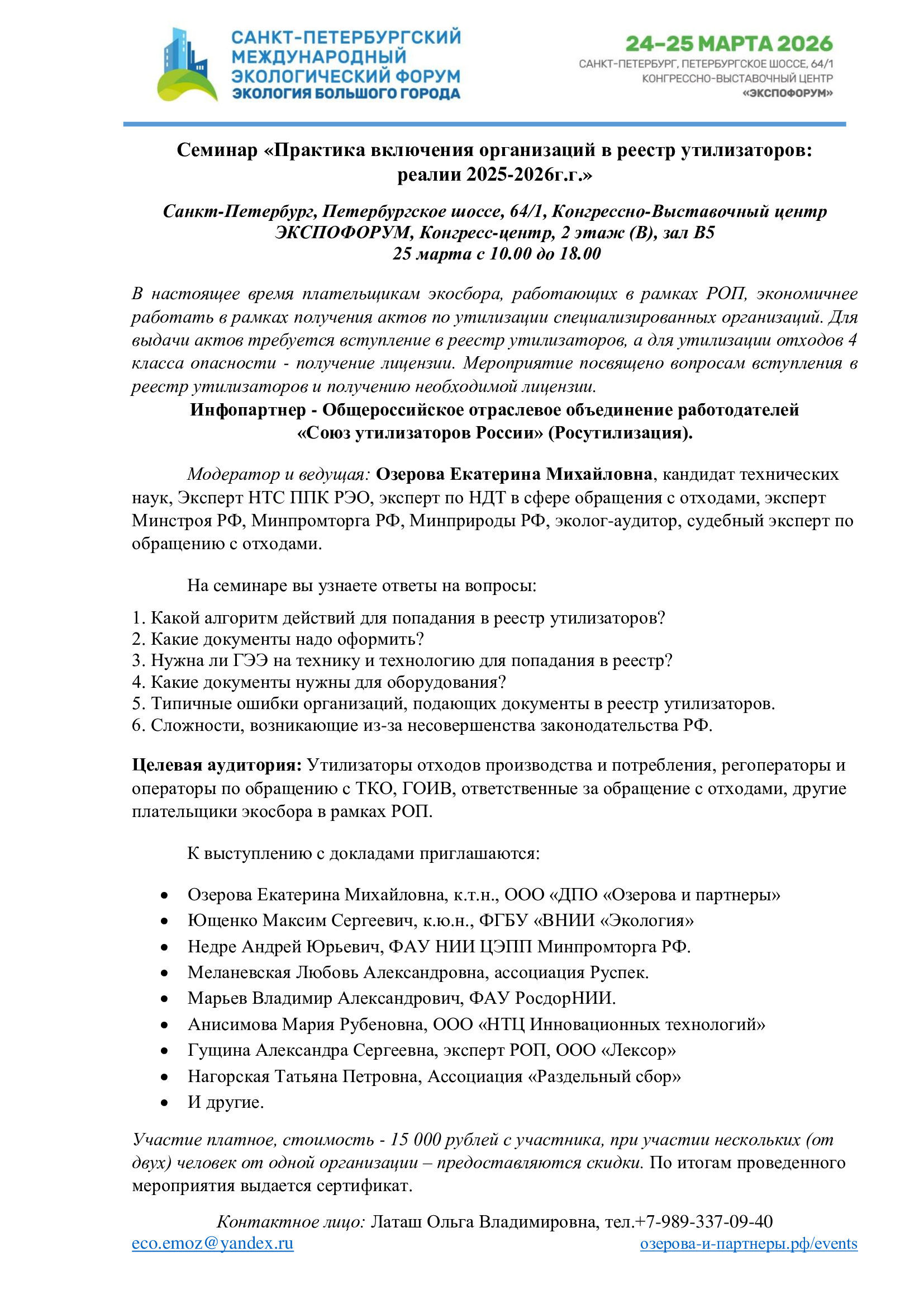Семинар «Практика включения организаций в реестр утилизаторов: реалии 2025-2026г.г.», С.-Петербург , 25 марта.